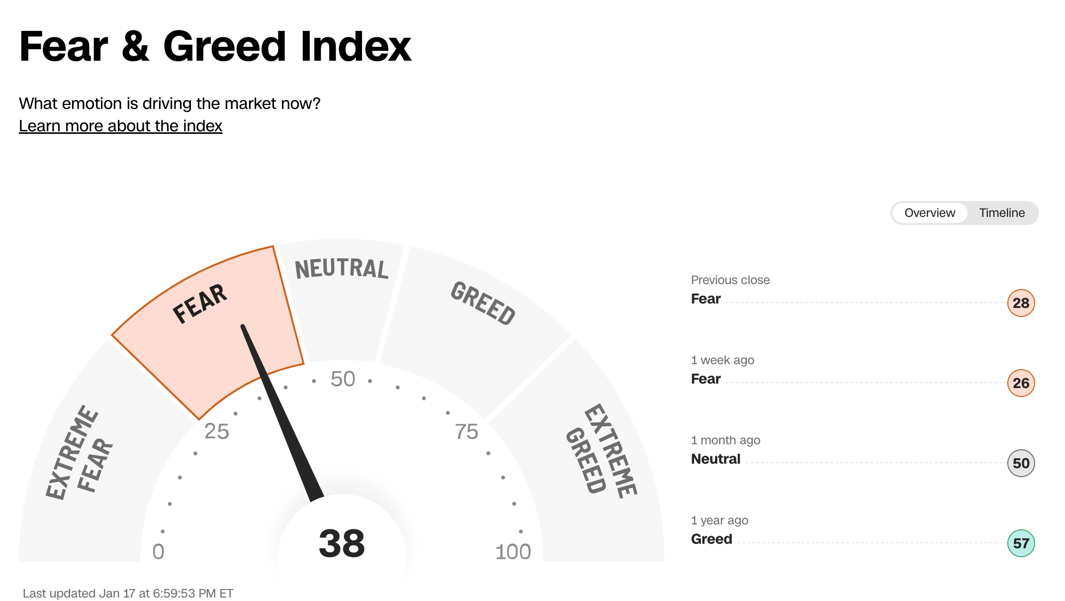 현재 공포 탐욕 지수는 "38"로써 탐욕의 구간에서 점차적으로 공포의 구간으로 들어오고 있는 중이라고 할 수 있습니다.