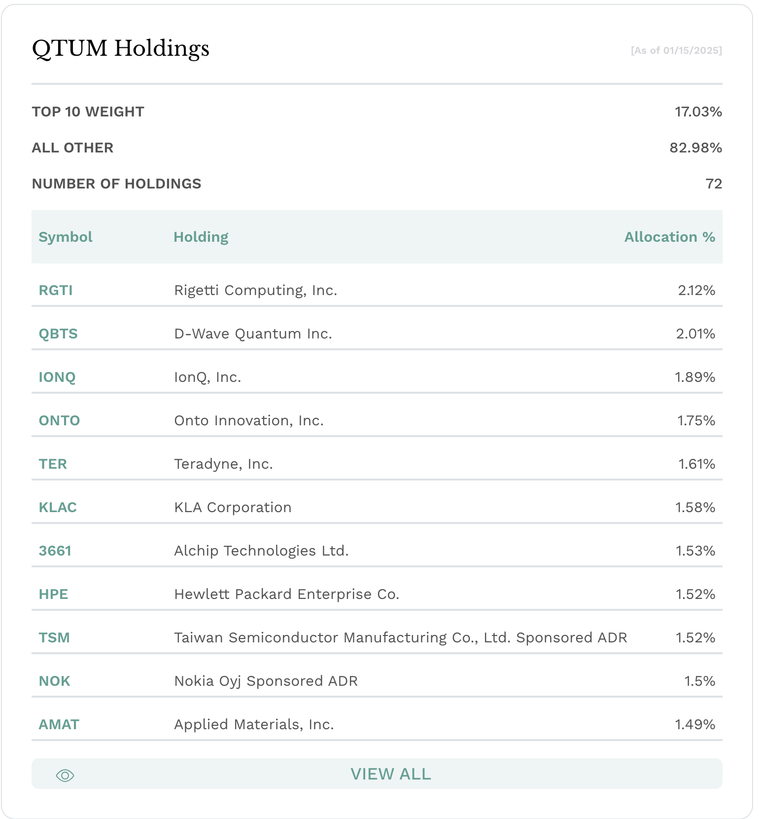 이 ETF는 BlueStar Machine Learning and Quantum Computing Index를 추종하며, 현재 양자컴퓨터에 관련된 72개의 기업들에 분산 투자하고 있습니다.