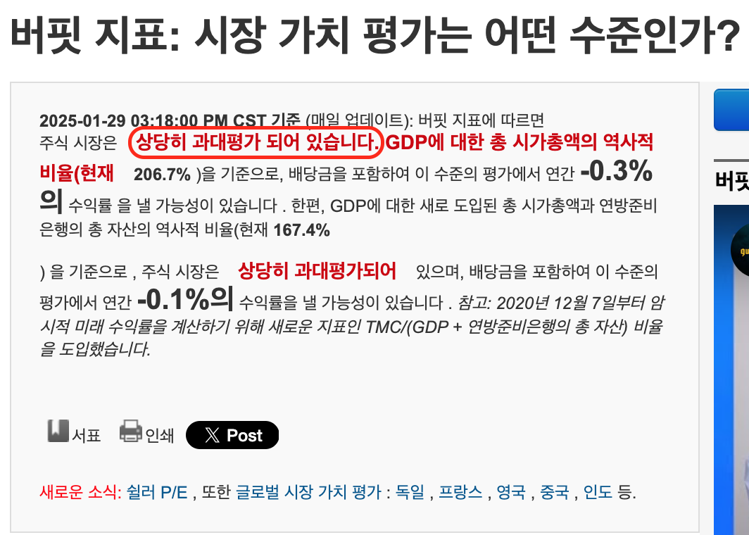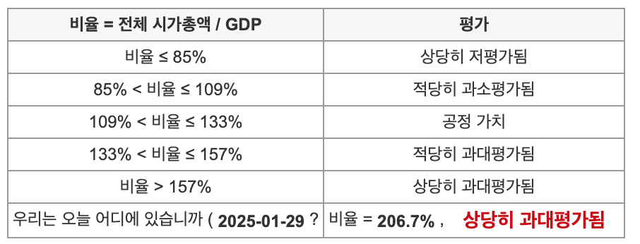 현재의 버핏 지수는 206.7%로(25년1월29일 기준) 역사적으로도 상당히 높은 수준의 수치를 보여주고 있습니다.