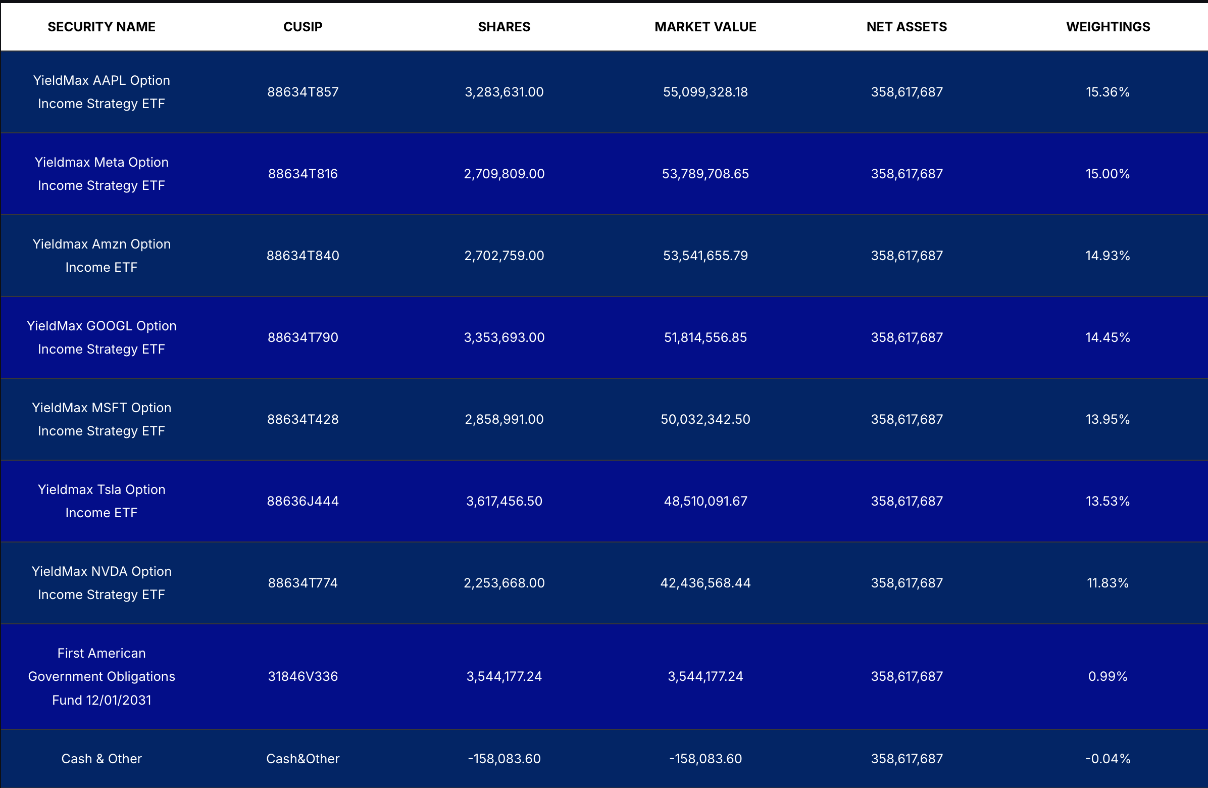 YMAG ETF는 미국 주식 시장에서 시가총액이 크고 안정적인 기업들을 중심으로 구성되어 있습니다. 대표적인 구성 종목으로는 다음과 같은 기업들이 있습니다: