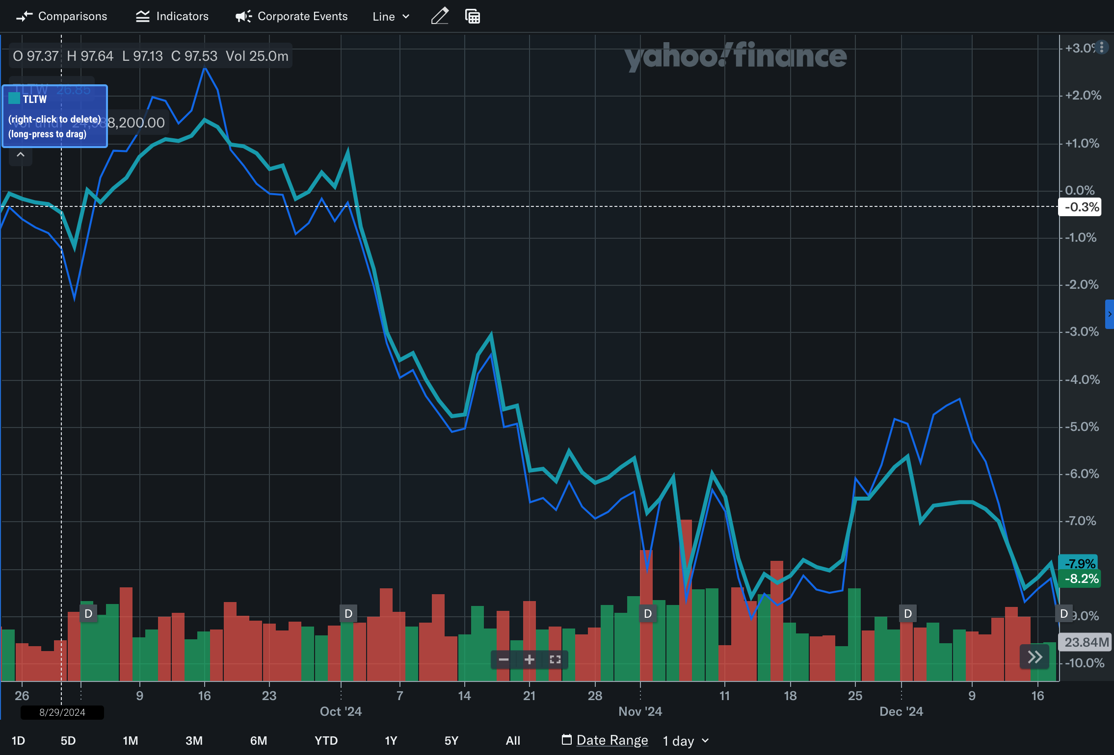 (기본이 되는 TLT의 주가가 상승하는것을 TLTW가 똑같이 따라기지 못하는 현상이 발생)