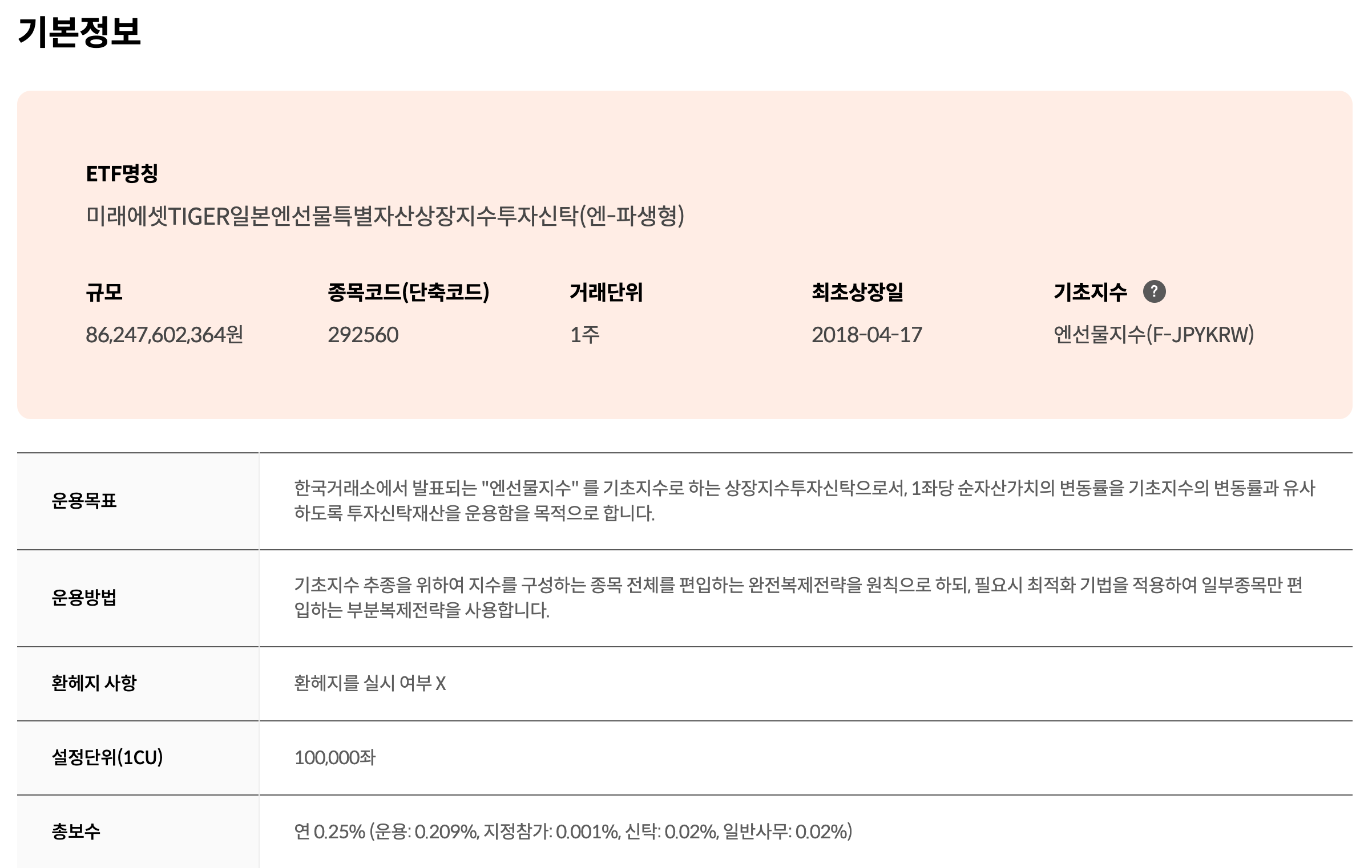 - 운용 방식: 선물 가격을 추종하는 방식으로, 일본 엔화 가치의 상승 또는 하락에 따라 수익이 달라집니다.