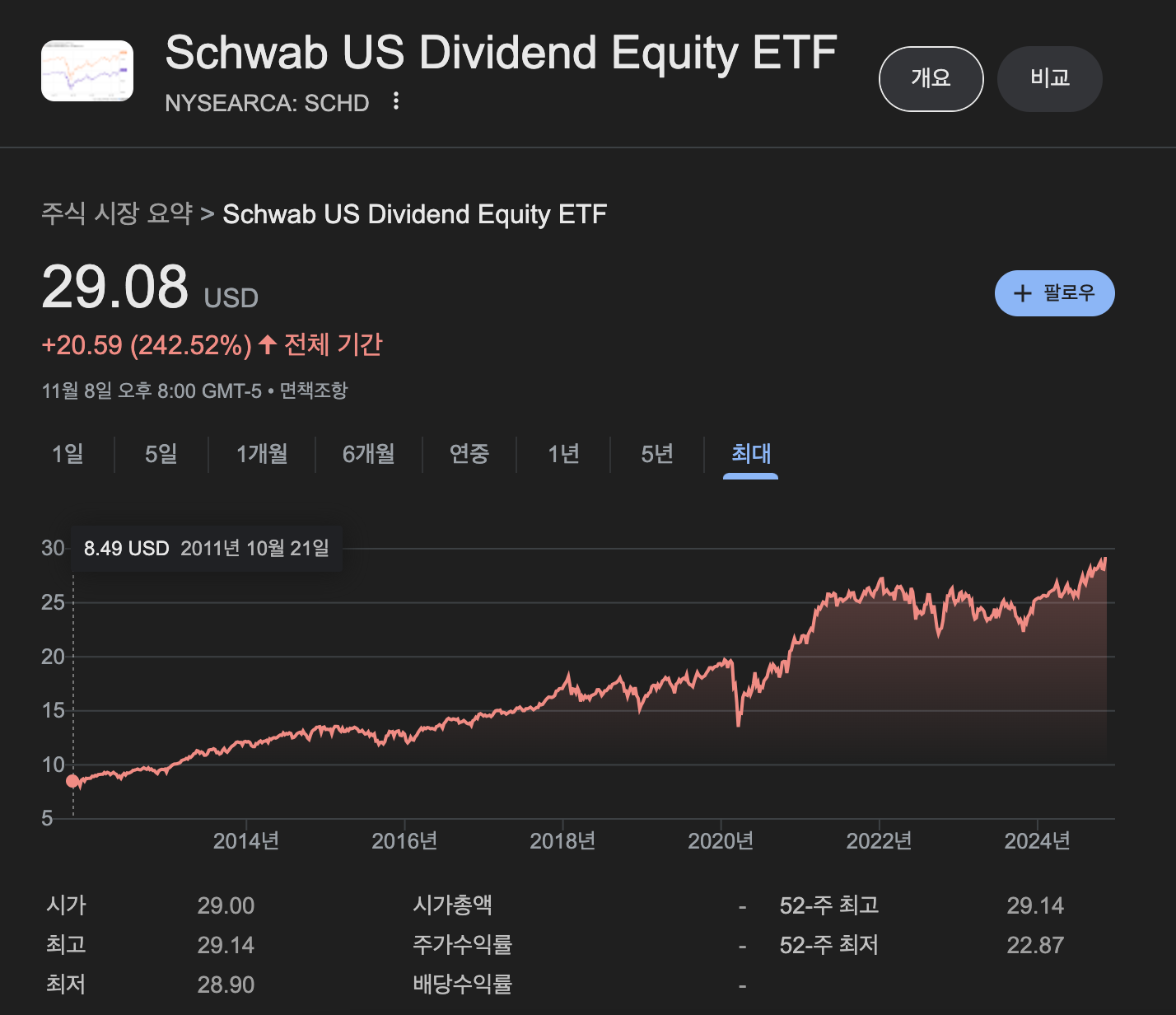 SCHD(Schwab US Dividend Equity ETF)는 2011년 Charles Schwab이 출시한 배당주 중심의 ETF로, 500억 달러 이상의 자산을 낮은 운용보수로 관리되어지고 있습니다.