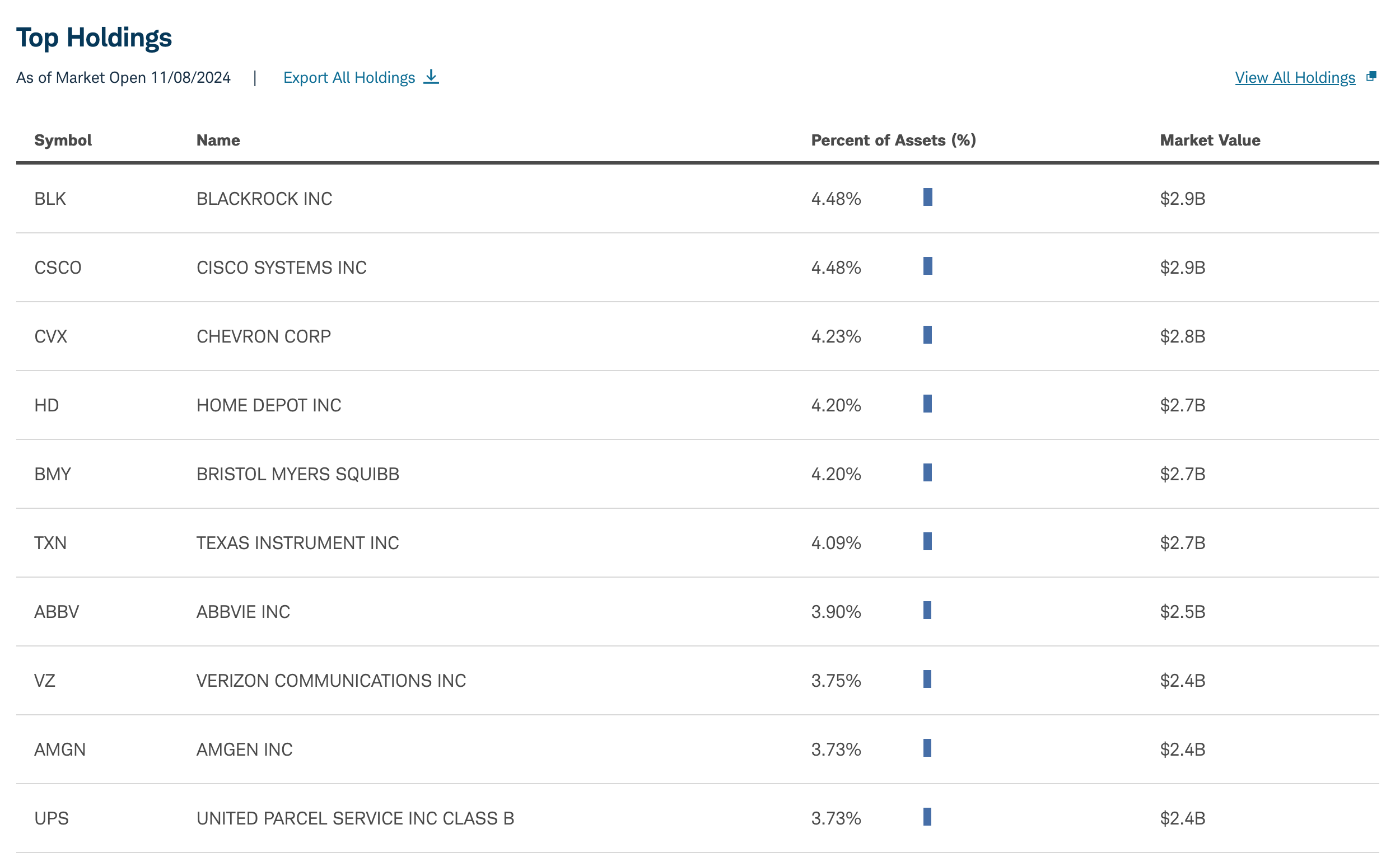 이 ETF는 다우존스 미국 배당 100 지수를 기본적으로 추종하며, 브로드컴, 암젠, 홈디포와 같은 재무건전성이 우수하고 안정적인 배당을 지급하는 약 100개의 미국 우량기업들에 투자합니다. 분기 배당금 지급과 우량 가치주 중심의 포트폴리오 구성으로 변동성을 낮추어, 안정적인 수익을 추구하는 장기 투자자들 사이에서 현재 큰 인기를 얻고있는 ETF라고 할 수 있습니다.