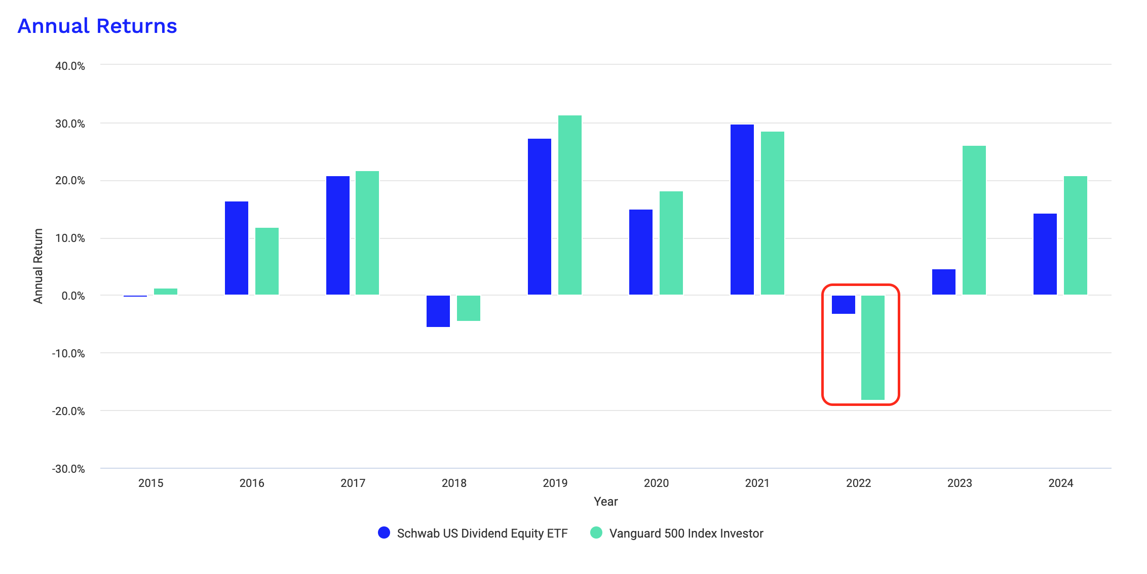 (2022년 큰 폭의 S&P500 하락에도 SCHD는 비교적 적은 변동성을 보여줍니다)