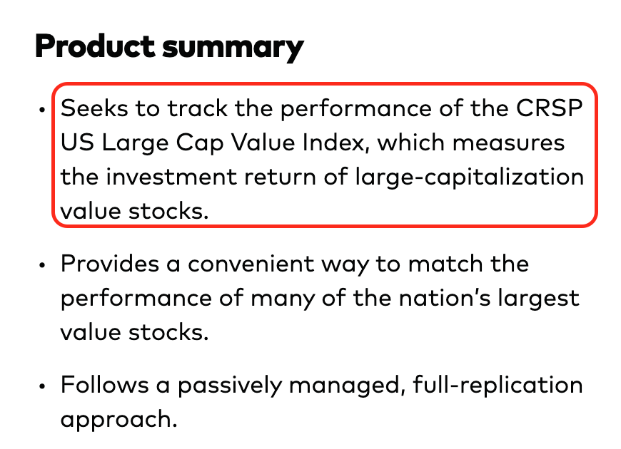 - 추종 지수: CRSP US Large Cap Value Index