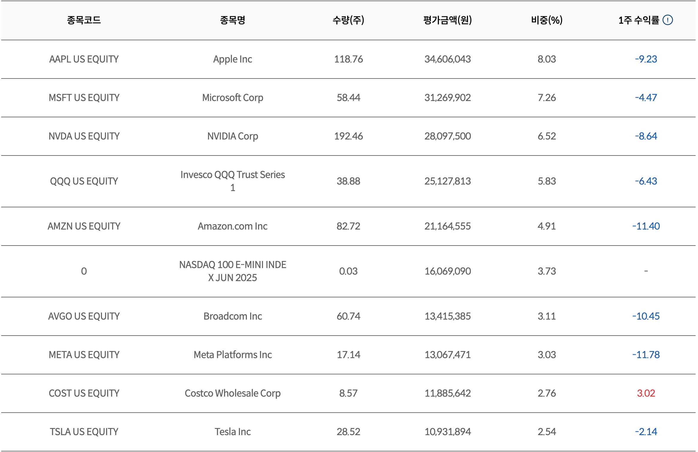 ETF의 포트폴리오는 나스닥100 지수에 포함된 주요 기술주와 콜옵션 매도 포지션으로 구성되어 있습니다. 주요 구성 종목과 비중은 다음과 같습니다.