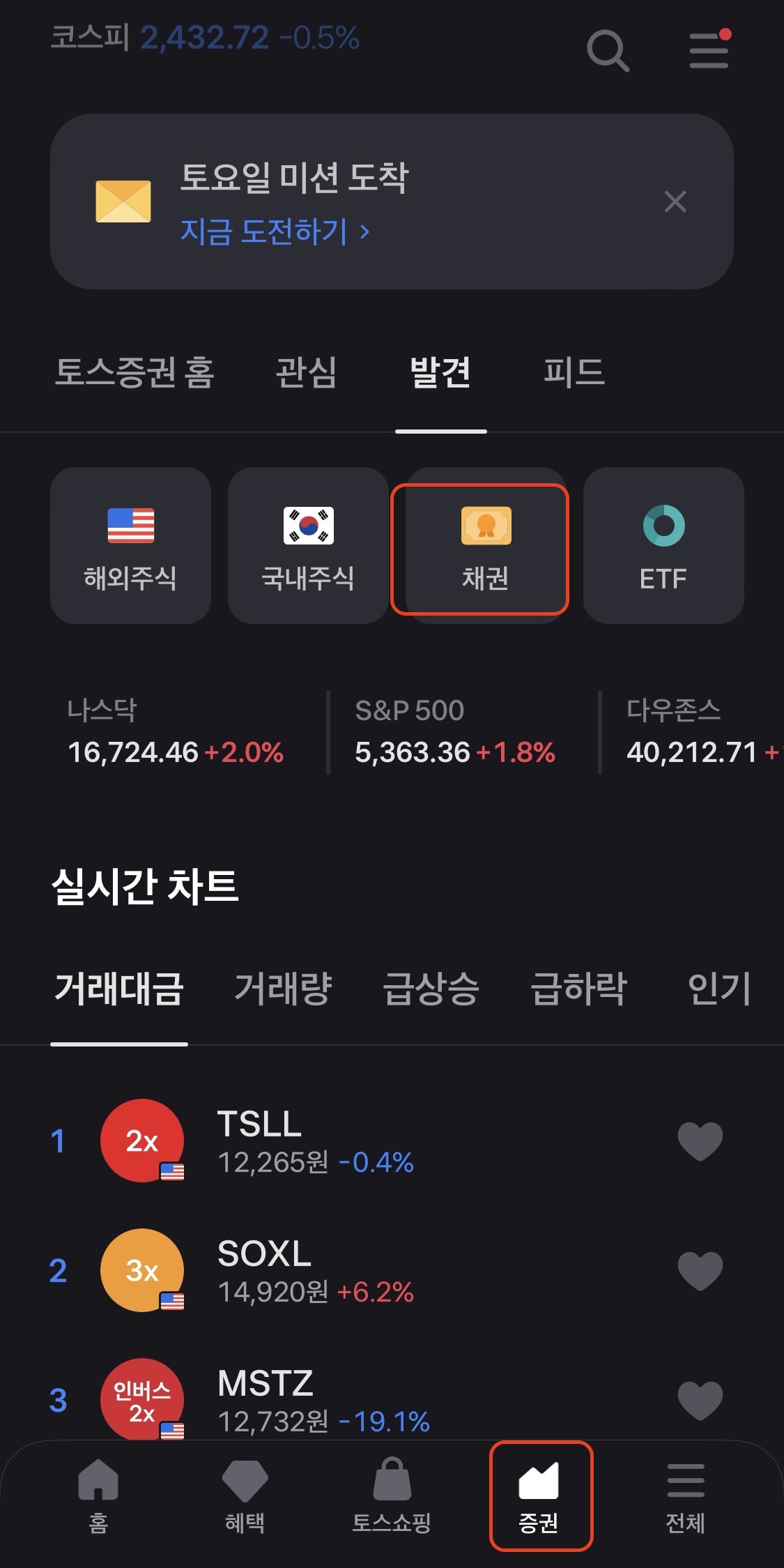 그다음 중간에 위치한 국내 주식 옆 채권 탭을 클릭해줍니다.