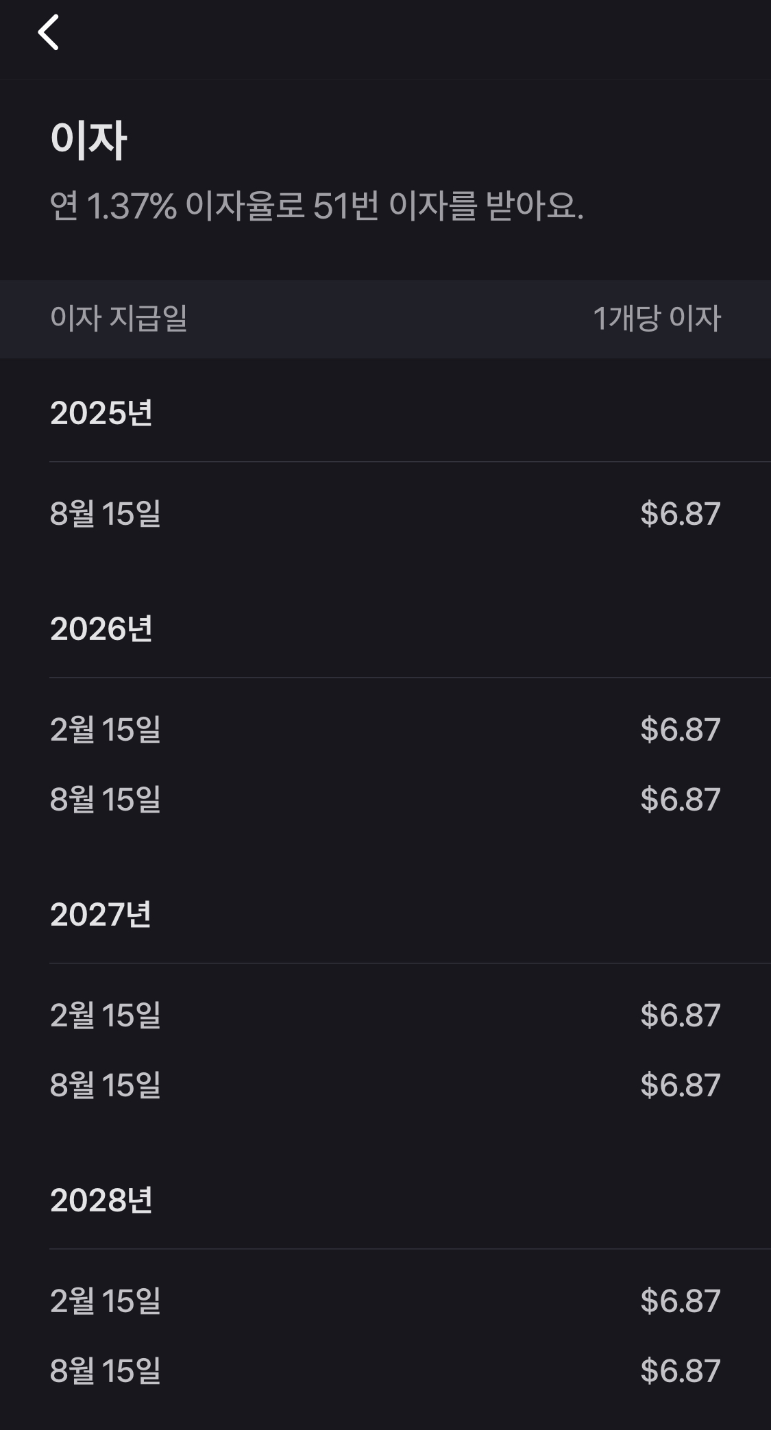 또한, 이 장기 국채를 1개 보유하고 있을 시 $6.87달러의 이자를 매년 2회씩 2050년 8월까지 최종적으로 51번에 걸쳐 수령을 할 수 있습니다.