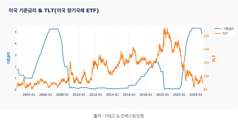 지금과 같은 금리 인하가 예상이 되는 시기에는 장기 채권이 우리의 위험자산의 리스크를 낮춰주는 자산으로 충분한 역할을 할 수 있습니다. 하지만 금리 인하의 정확한 시기를 예측 하기란 불가능에 가깝다고 할 수 있습니다. 그렇기 때문에 조금 장기적인 관점으로 천천히 분할 매수를하면서 포트폴리오에 천천히 편입 해나간다면 갑작스러운 경기 침체로 인한 금리 하락기에 포트폴리오의 전체의 하락을 방어하고 높아진 장기채를 매도하여 위험자산을 저점에서 추가 매수 할 수 있는 좋은 방어적 자산의 역활을 할 수 있다고 생각합니다.
