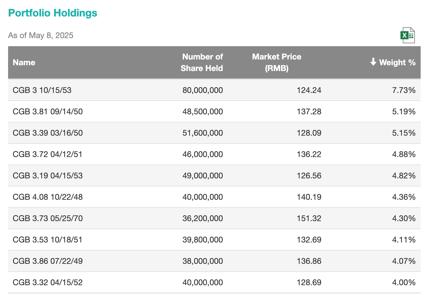 이 ETF는 ICE 10+ Year China Government & Policy Bank Index를 추종하며, 중국 국채 및 정책은행 채권에 100% 투자해 장기 듀레이션 자산배분 포트폴리오를 제공하는 ETF입니다.