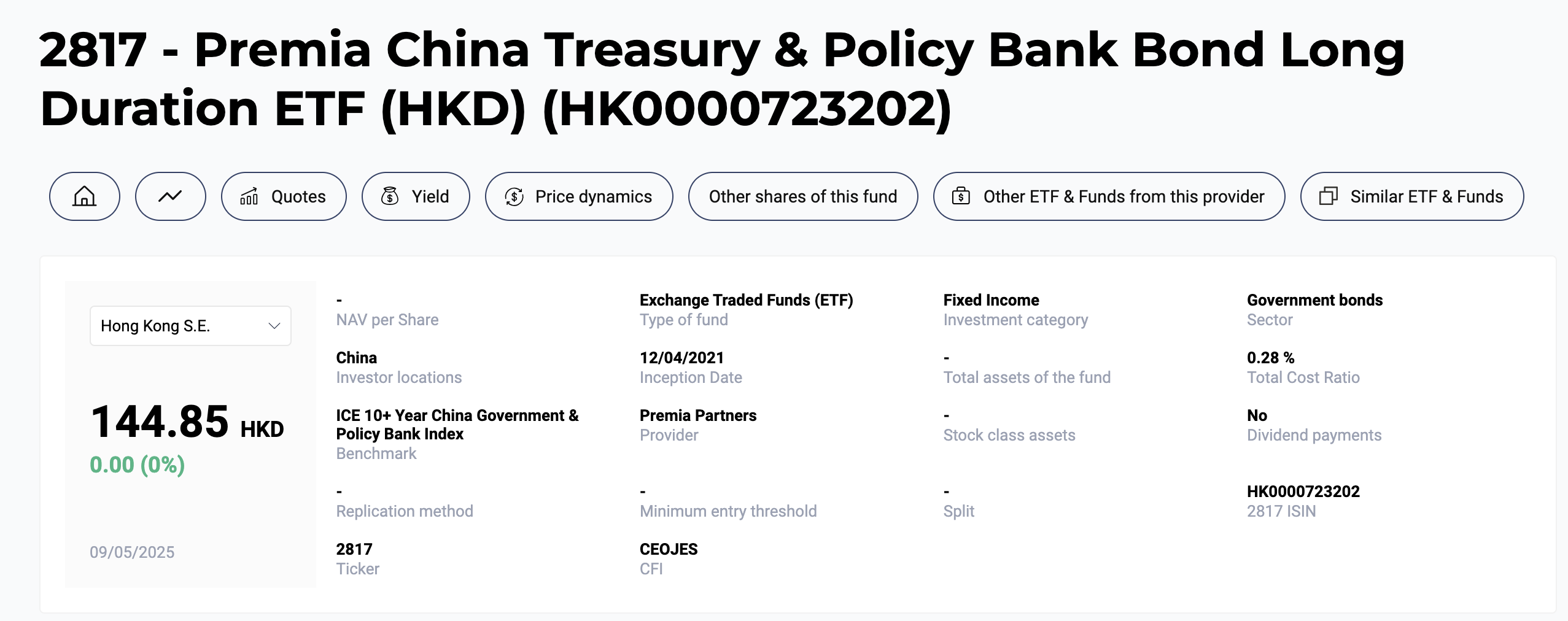 Premia China Treasury & Policy Bank Bond Long Duration ETF(홍콩: 02817)은 중국 A1 등급 국채 및 정책은행 채권만을 편입하는 Fixed Income ETF이며, 기초지수인 ICE 10+ Year China Government & Policy Bank Index는 만기 10년 초과의 중국 국채·정책은행 채권으로만 구성되며, 장기 듀레이션 전략에 최적화되어 있습니다.