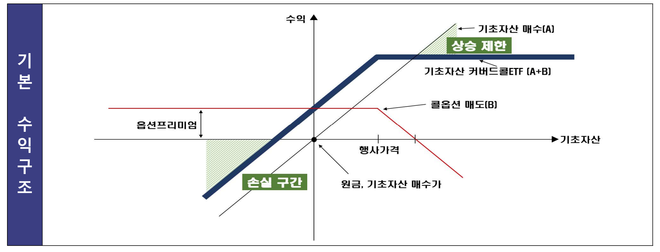 이러한 구조 덕분에 커버드콜 상품을 보유한 투자자는 기초 자산의 주가가 횡보를 하거나 혹은 약간의 강세장 환경에서 유리하며, 확실한 상승장에서는 주가 상승분의 100% 수익을 얻지 못합니다.