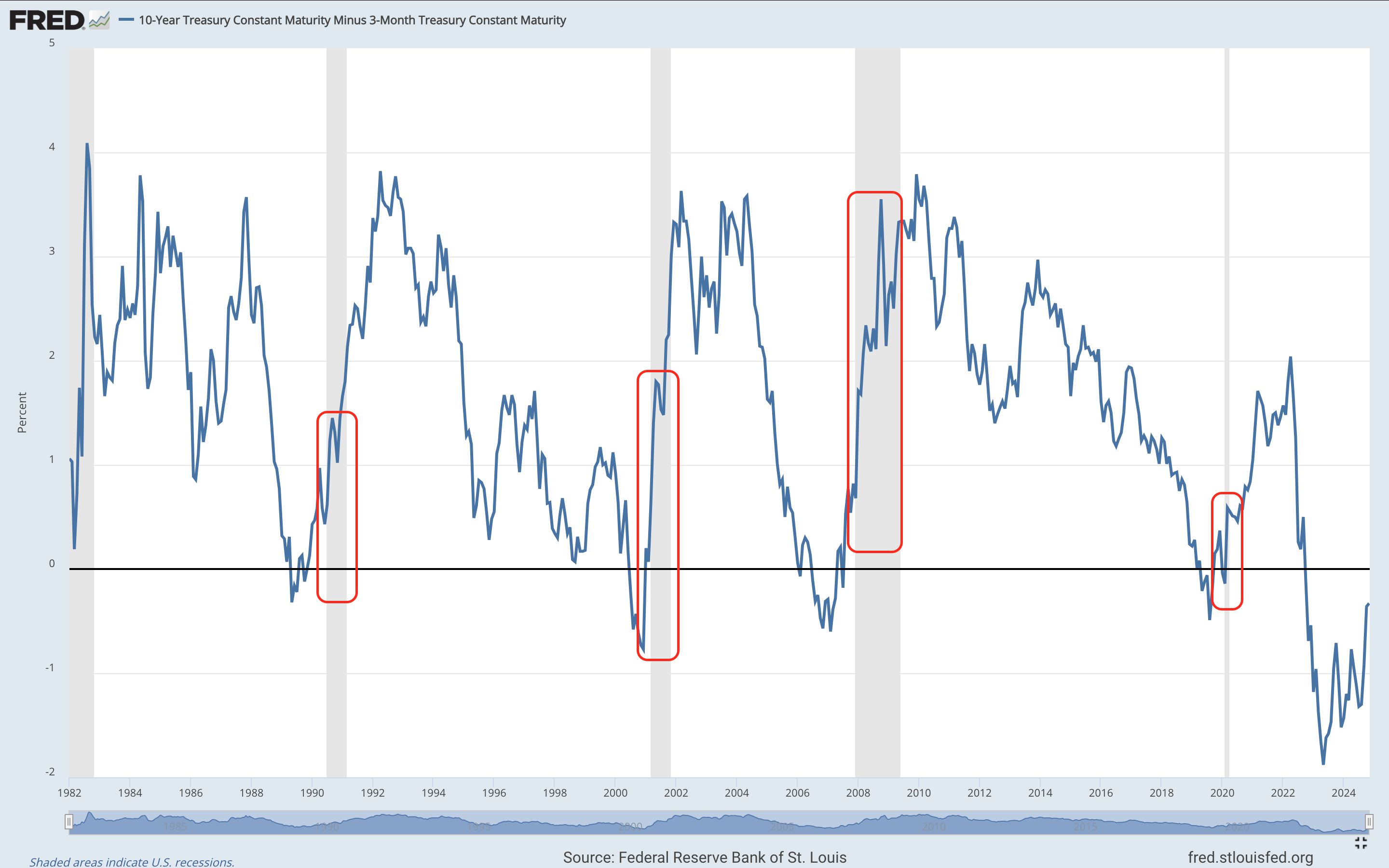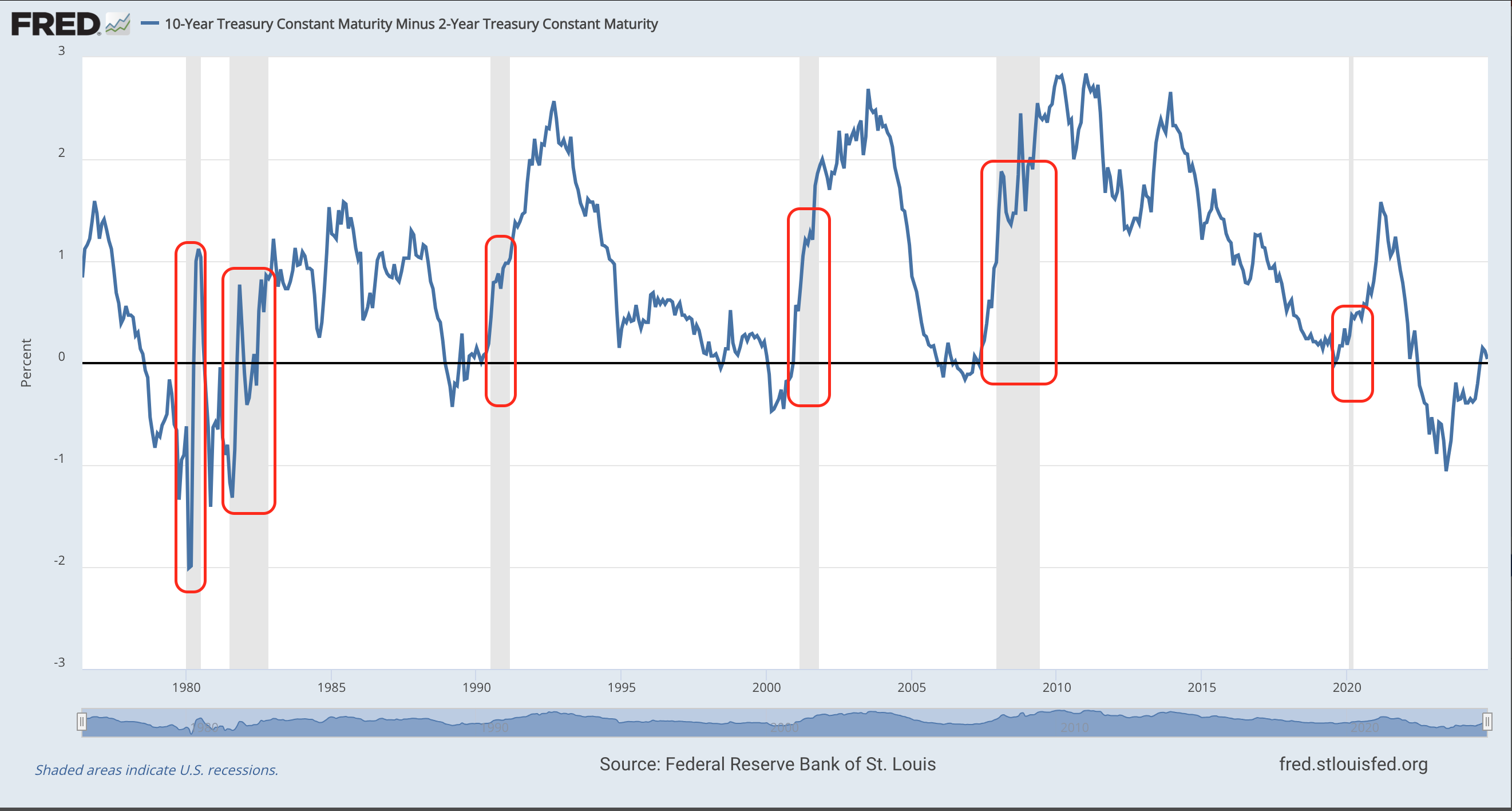 과거 사례로 보는 리세션 가능성 역사적 데이터를 살펴보면, 금리 역전은 리세션의 신뢰할 만한 선행지표였습니다. 재미있는 점은 대부분의 경제 침체기간은 장단기 금리차가 역전이 되었을때 발생한것이 아니라.. 그 역전이 회복되고 난뒤! 일정한 시간이 지난 다음에 경가 침체로 접어들었다는 점입니다.(회색 음영 부분이 경제 침체 기간을 보여줌)